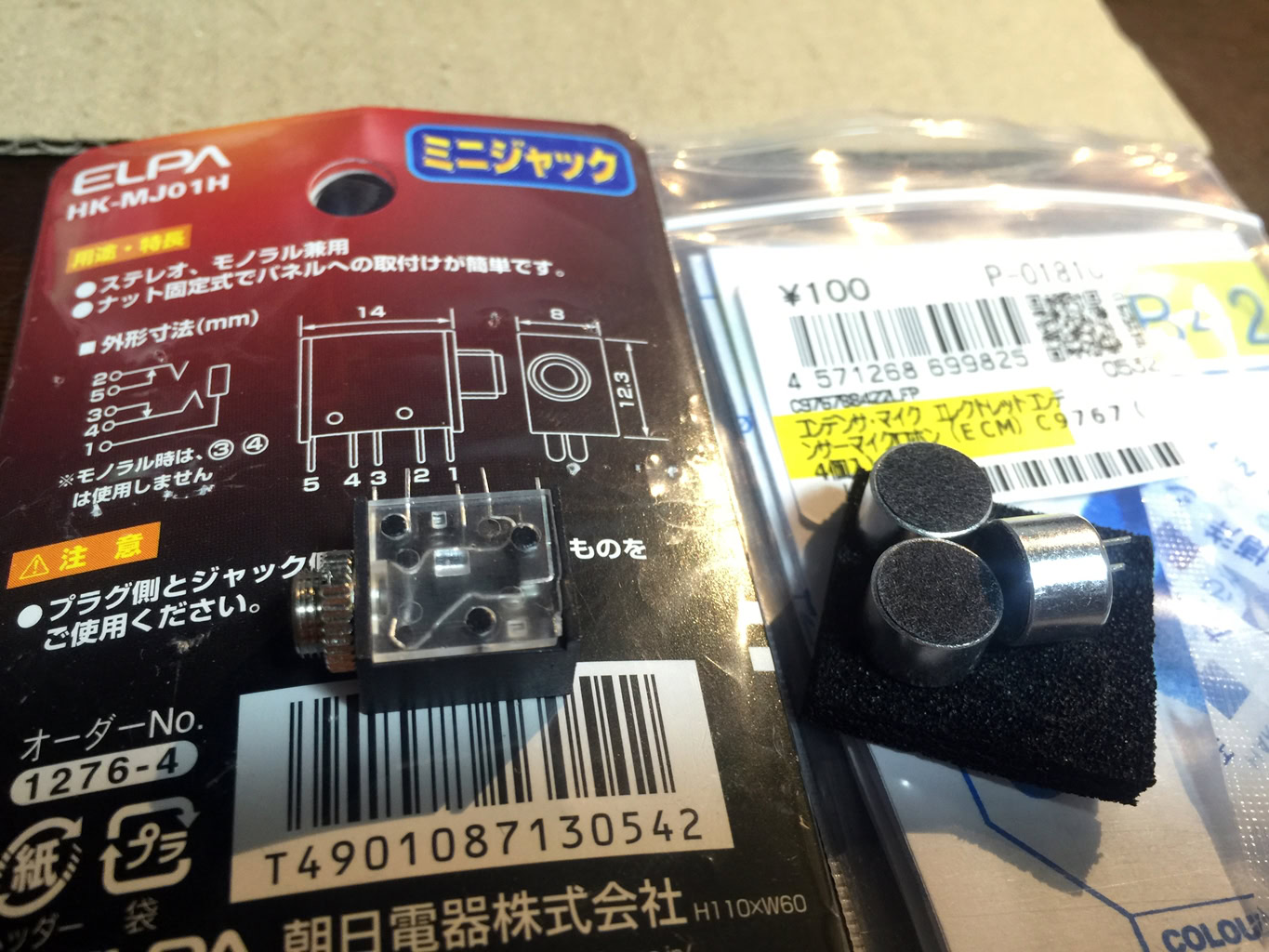 基盤上の内蔵マイクを取り外して古い部品箱に入っていた3.5mmジャックを付けていた。これだと外部マイクをつながないときに無音になってしまうので、4個¥100のコンデンサマイク(直径8mmくらい)とバイパス端子付きのStereo3.5mmジャックを買ったので、それに置き換えた。内蔵マイクも結線。最初についていたのが直径4mmくらいのモノで音は最悪だったが今回付けたモノはかなり良い音で拾ってくれる。外部マイクにしなくても良いかも(^^;