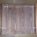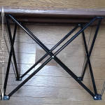 DAISO の折りたたみテーブルは天布を外すと、広げたり縮めたり、大きさを変えられます。なので杉板4枚並べてフレーム固定用に、昔、本箱?箪笥?を解体したときのホゾに入れて固定していた板が2枚あったので、それも切らずに使いました。